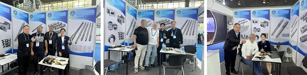 Sa exhibition, angZhoushan Nanhaiyaang booth napuno sa mga bisita. Ang mga produkto sa bituon nga gipakita sa eksibisyon, sama sa dual-alloy screw ug barrel ug ang nitrided screw ug barrel, nakadani sa kaylap nga pagtagad sa mga parameter sa pasundayag nga labaw sa mga sumbanan sa industriya. Ang mga produkto sa Nanhaiya kay gihimo ang tanan gikan sa 38CrMoAl nga haluang metal nga asero ug gihimo pinaagi sa daghang mga proseso, lakip na ang pagpalong ug pag-temper, pag-ila, ug katukma nga machining. Sa partikular, ang barrel discharge port, usa ka huyang nga seksyon, adunay usa ka bag-o, bug-os nga bilog nga carbide spray coating, nga nakab-ot ang internal nga katig-a sa 62HRC, usa ka hinungdanon nga pag-uswag sa average sa industriya nga 58HRC.